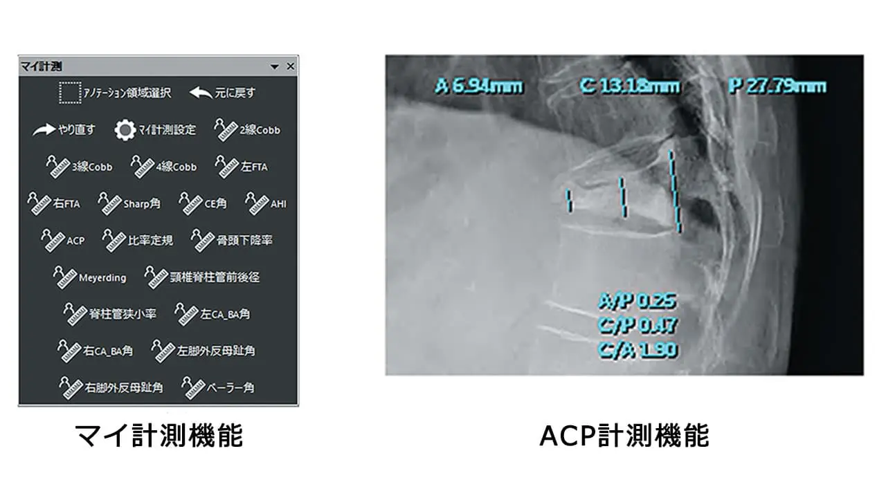 距離や⾓度計測などの⼀般的な計測はもちろん、少し複雑な計測機能を登録できる“マイ計測機能”を標準搭載。