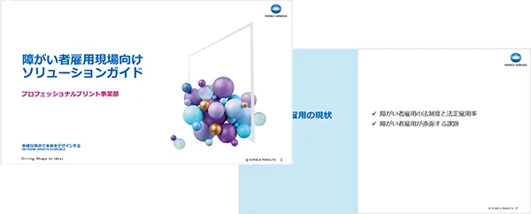 障がい者雇用の現場課題や業務改善のヒントを、実例とともに分かりやすくまとめたガイドです。業務創出として障がい者雇用と親和性の高い印刷業務の活用事例、支援スタッフの方向けの研修サービスや導入後のサポートまで、トータルで支援する具体策をご紹介します。