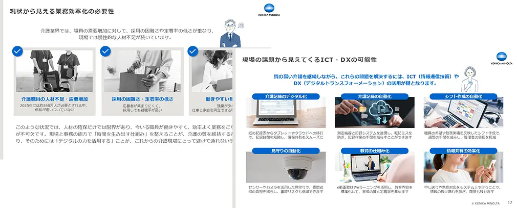 私たちコニカミノルタジャパンは、介護福祉の現場に深く寄り添い、業務改善・⼈材育成・制度対応までをワンストップで支援できるトータルソリューションベンダーです。システム・機器・物販・教育――それぞれの“点”を、介護現場の課題解決という“線”でつなぎ、実践につなげる⼒があります。