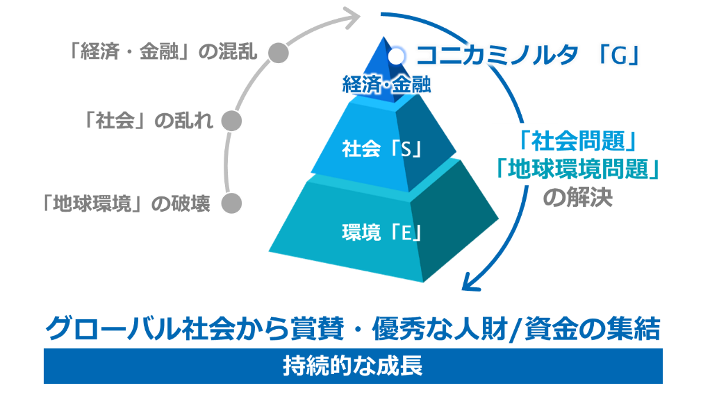 コニカミノルタは、「新しい価値の創造」という経営理念のもと、その時代に求められる新しい価値を追求しながら、社会とともに発展してきました。社会のサステナビリティを追求することは、企業のサステナビリティを高めていくことにもつながります。地球環境の破壊によって社会が乱れれば、経済・金融に影響を及ぼします。しかし地球環境や社会の問題解決を図ることができれば、将来的なリスクに備えるとともに、企業の成長の機会になりえます。
