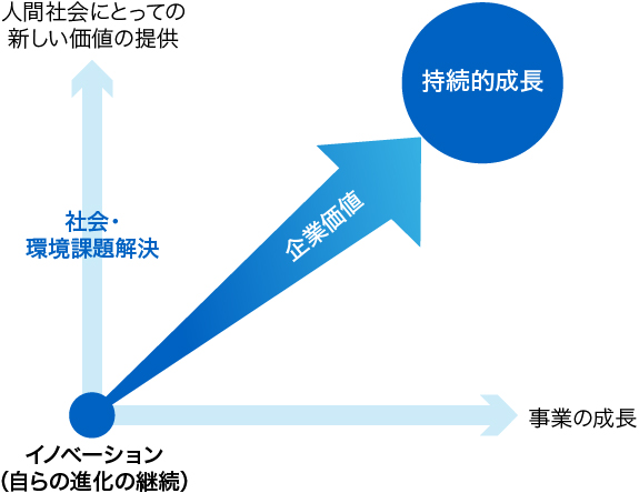 企業が持続的に成長するためには、「人間社会にとっての新しい価値の提供」と「事業の成長」をともに実現するアプローチを継続していくことが必要です。自らの進化の継続――イノベーションを源泉に、社会・環境の課題を解決しながら、それを事業の売上、利益につなげていくことで、企業価値を高め、持続的な成長を実現することができると考えています。