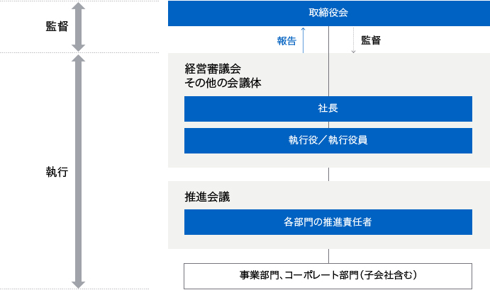代表執行役社長がサステナビリティマネジメント全体についての最高責任と権限を有し、その有効性について責任を担っています。代表執行役社長のもと、サステナビリティを担当する各役員がグループ全体のサステナビリティマネジメントを推進しています。重要なサステナビリティ課題に関する議論や意思決定は、経営戦略・事業戦略との連動性向上を目的に、ほかの重要な経営課題と同様に、意思決定の場である経営審議会などの会議体で行っています。