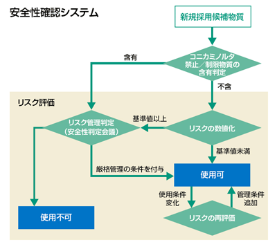 コニカミノルタは、製品化プロセスにおいて、新たに使用する化学物質に対して、採用候補の段階でリスクを評価する仕組みを構築しています。これにより、製品安全、環境保全、労働安全の各側面において、合理的な化学物質リスク評価を実施し、適切な管理を行っています。