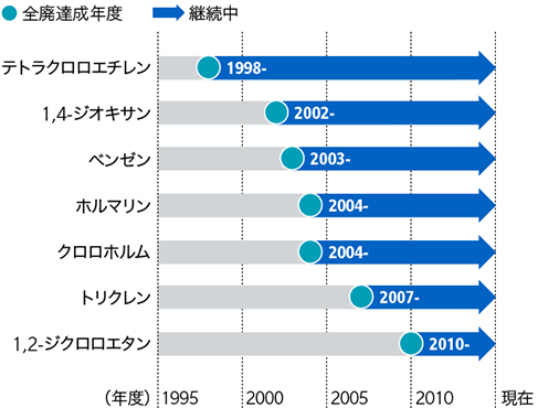 化学物質の有害性と使用量からリスクを評価し、リスクが高いと判断したものの代替化や削減に取り組んでいます。大気排出のVOC(揮発性有機化合物)について、1993年から世界各国の生産拠点で排出量削減に取り組んでいます。