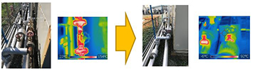 日本国内で化学製品を生産しているコニカミノルタケミカル(株)では、ボイラーで製造した蒸気の配管、特にフランジやバルブ部分などの未保温部からの放熱ロス削減に取り組んでいます。サーモグラフィーで配管の表面温度を調査し放熱量が多い箇所を特定。効率的に断熱施工を実施することで放熱ロスを削減しました。