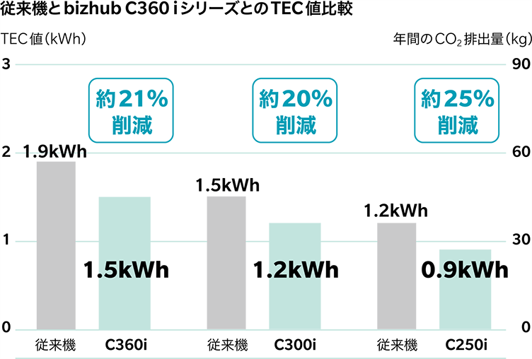 2024年に発売した後継機「bizhub C361i」シリーズでも、同等以上の低TEC値を実現しています。