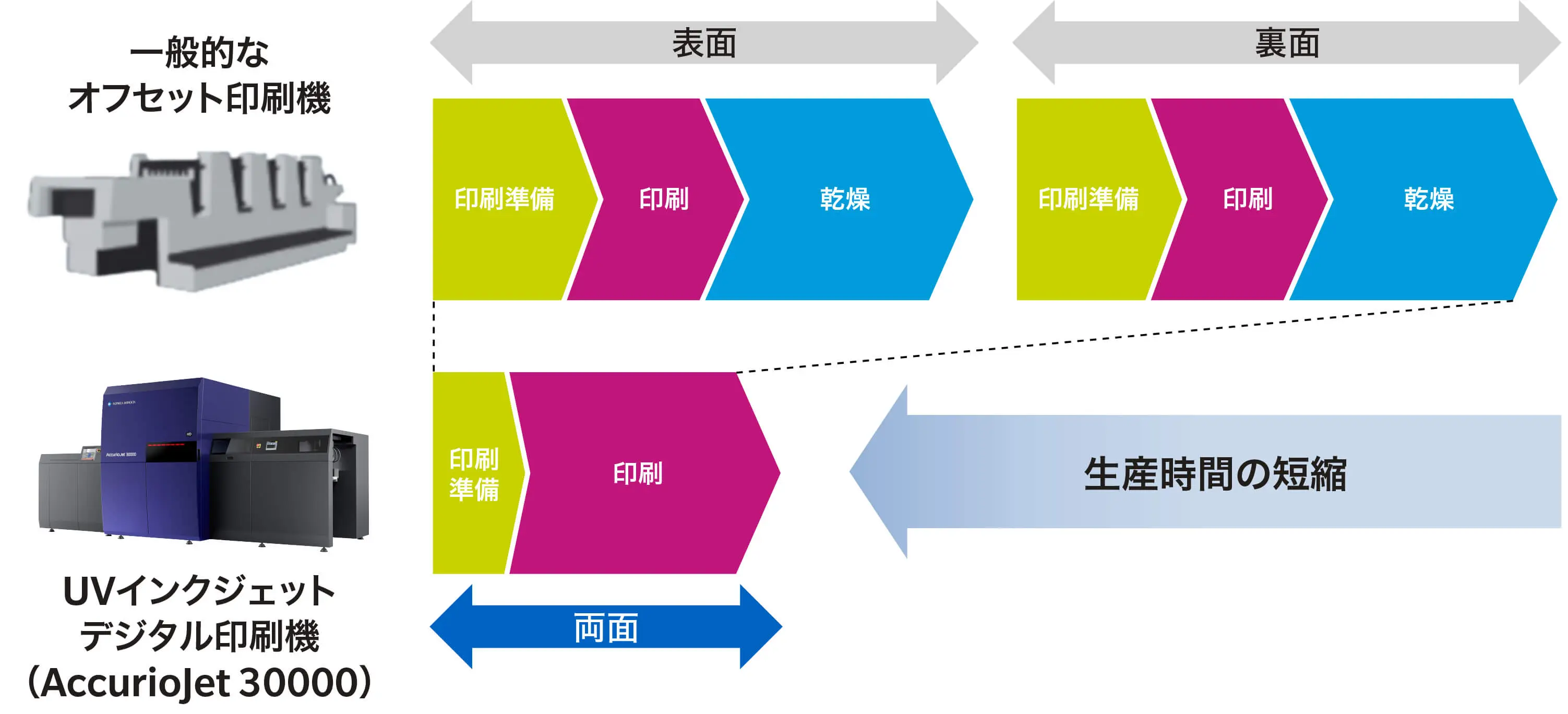 オフセット印刷機とUVインクジェットデジタル印刷機「AccurioJet シリーズ」の生産時間比較