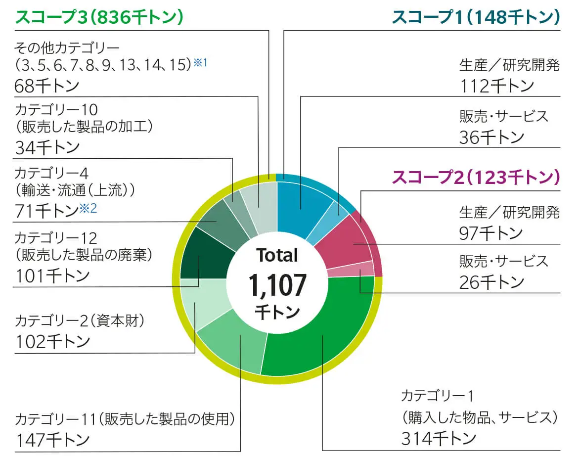 | 1 | 購入した物品、サービス | 情報機器および消耗品については販売数量や生産数量、その他製品については資源投入量に、それぞれの製品を構成する素材の排出原単位等を乗じて算出しています。 |