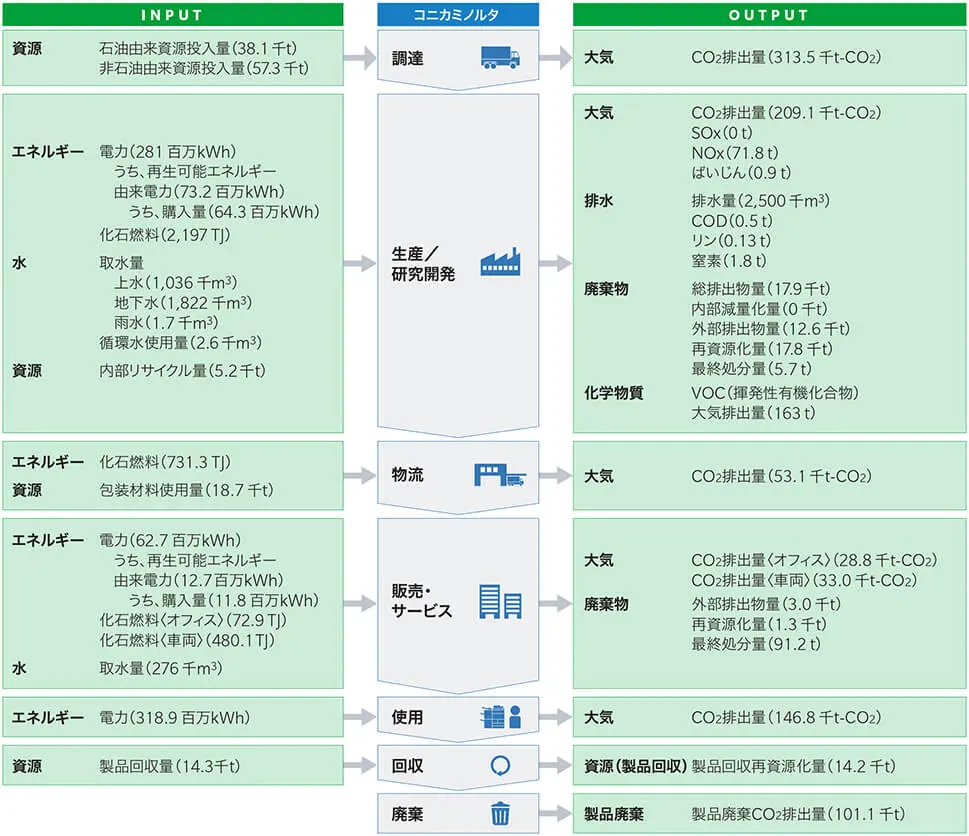 コニカミノルタでは、事業活動全体のエネルギーや資源の投入量と、温室効果ガスの排出量や排出物量などを、製品のライフステージごとに測定しています。この結果を分析することによって、環境負荷低減に向けた具体的な取り組みに活用しています。