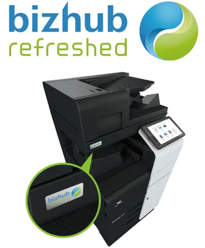 回収した複合機はコニカミノルタの定めた作業基準に従って清掃、動作確認、データ消去、ファームウェア・アップデート、安全性検査を行い、必要に応じてコニカミノルタ純正部品を用いた部品交換を実施します。最終チェックに合格した複合機には、安心してご利用いただける性能・品質レベルを備えた製品の証として、「bizhub refreshed」ラベルを貼付しています。