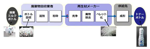 コニカミノルタでは、ポリエチレン製ミルクボトルを複合機用のトナーボトルにリサイクルしています。牛乳の臭いや品質悪化につながる微細細胞を取り除く洗浄技術を開発し、メキシコとマレーシアで量産体制を確立しました。トナー容器の原材料におけるPCR比率は40%にまで高めることに成功しており、今後は100%に引き上げることを目指します。