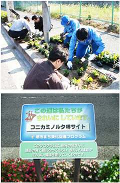 コニカミノルタ堺サイト(大阪府堺市)は、大阪府が推進するアドプト・ロード・プログラムに2002年から参加し、サイト周辺の道路の美化活動として花壇の整備・維持を行っています。2007年は、11月14日にサイト前のバス道路(深井畑山宿院線)の花壇で植え替えを行いました。花壇の植え替えや水遣り・除草などの維持作業は、堺サイトを構成する合計7社のコニカミノルタのグループ会社が力をあわせて行い、道路環境を美しく保っています。