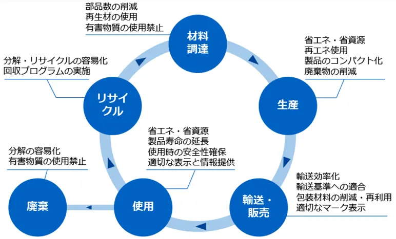 自社が定める環境影響の評価軸に沿って目標を設定し、商品化フローの中で製品アセスメントを実施します。達成状況をチェックし、目標値をクリアした製品のみが市場に送り出されることで、最新の環境順法の対応・含有化学物質の管理・製品の環境性能向上・各国環境ラベルへの適合を確実に実行することができています。