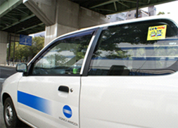 「関西支社サイト」を構成している13のグループ会社は、各社が使用している営業車合計約210台を協力車両として届け出て、2月から運動に参加しています。これらの車両には「動くこども110番」の車両であることがわかるようにステッカーが貼られ、運転者は、もしも助けを求める子どもがいた場合には、保護をした上で状況に応じて110番や119番に通報し、警察や消防署の到着まで子どもの安全を確保します。(右写真:ステッカーが貼られた車両)