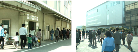 プログラムは、前述のサイト代表の挨拶を皮切りに、サイトレポート「コニカミノルタ大阪狭山サイト 環境・社会報告書2007」に基づき、環境の取組みをはじめ、安全防災や地域交流などの状況を報告いたしました。その後は、参加いただいた方々を構内にご案内し、環境設備や生産現場など、普段はお見せできない構内の活動についてご覧頂きました。また、建設中の新棟(写真右)についても、特別に建物内部をご覧頂き、環境配慮設計を紹介いたしました。地域の方々からは、「人感センサーを用いた給湯室照明や階段の非常灯の省エネ設計が実感できました」「光庭の採光は明るくて広々感があっていいです」などのご感想を頂きました。