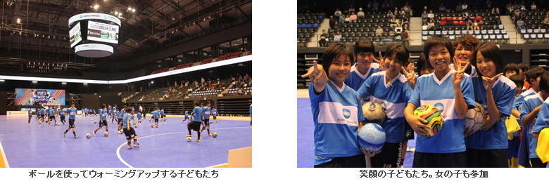 最新鋭の映像設備や音響施設を備えたゼビオアリーナ仙台で、憧れのトム・バイヤー氏やフットサルFリーグの湘南ベルマーレの選手から指導を受けられるとあって、子どもたちはクリニック開始前から大はしゃぎ。