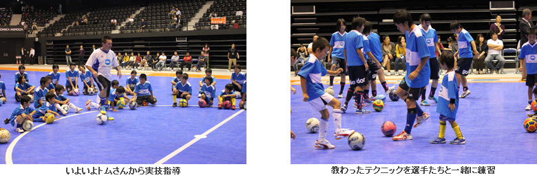 メイン講師であるトム・バイヤー氏は、子どもたちにサッカー技術の向上のためのコツや、一人でもできる練習等、デモンストレーションを交えながら熱血指導。