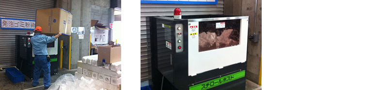 コニカミノルタでは、限りある地球資源の有効活用の最大化と資源循環をめざし、リデュース・リユース・リサイクルの3Rの取り組みをグローバルに推進しています。複合機の梱包材として使われる発泡スチロールは、緩衝材として高い性能を持つ特長がある一方、使用後にかさ高いものを産業廃棄物処理業者がトラックで運搬が必要なため、より効率のよい資源循環を課題として認識していました。このような背景のもと、環境意識の高い欧州では、イギリスの販売会社が2007年から、ドイツの販売会社が2010年から、梱包材の発泡スチロールを圧縮して再資源化する取り組みを開始しています。