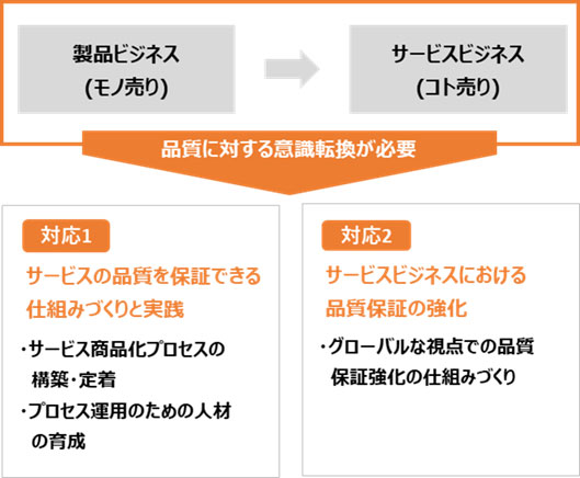 サービスビジネス領域では、“モノの保証”から“コトの保証”への転換とプロセスの変革が求められています。“コト”は“モノ”と比べ、「形がない」「品質の事前確認ができない」「結果だけでなくそこに至る過程も重要」などの違いがあり、高信頼品質の実現に向けた課題となっています。