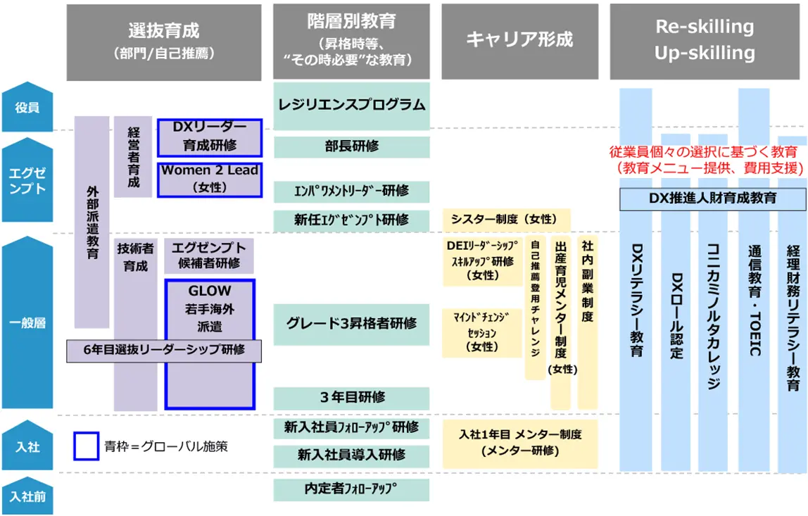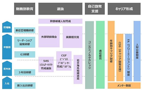 コニカミノルタ(株)では、OJD※ を基本として、その効果をより高めるため、4つの軸で教育体系を構築しています。すなわち、将来の社長候補やグローバルでの活躍を期待するポテンシャル人財など、人財を定めて必要な投資を行う「選抜型教育」、入社時やプロモーションタイミングの人財あるいは組織をリードする立ち位置にある人財を対象とした「階層別教育」、女性リーダー育成に向けたマインドチェンジやメンター教育などの「キャリア形成支援」、MBA・学位取得などに活用できる最大150万円/年の自己啓発支援、豊富な社内教育プログラムなどの自らが学びたいものを定めそこに必要な支援を行う「Re/Up skilling」となります。これらの教育投資とチャレンジ評価や人財公募、副業解禁などの多様な制度をかけ合わせ、個の力の最大化と同時にこれら人財の力を最大限に引き出せる組織風土づくりに取り組んでいます。
