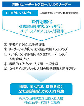 会社経営を担える次世代リーダーを計画的に配置・育成するため、2020年度よりポテンシャル人財を可視化し、CEOと事業トップが1on1で育成の方向性を確認・議論する場を設けています。この議論を通して、次の事業トップ候補はいるか、3~5年後を見据えたらどうか、という組織課題を明確にし、そのうえで、後任候補の特定とさらなる成長に向けて担わせる役割をCEOと事業トップが握り、次の1年間の成長度合いを確認する、というサイクルを回して、150名規模の計画的育成を行っています。