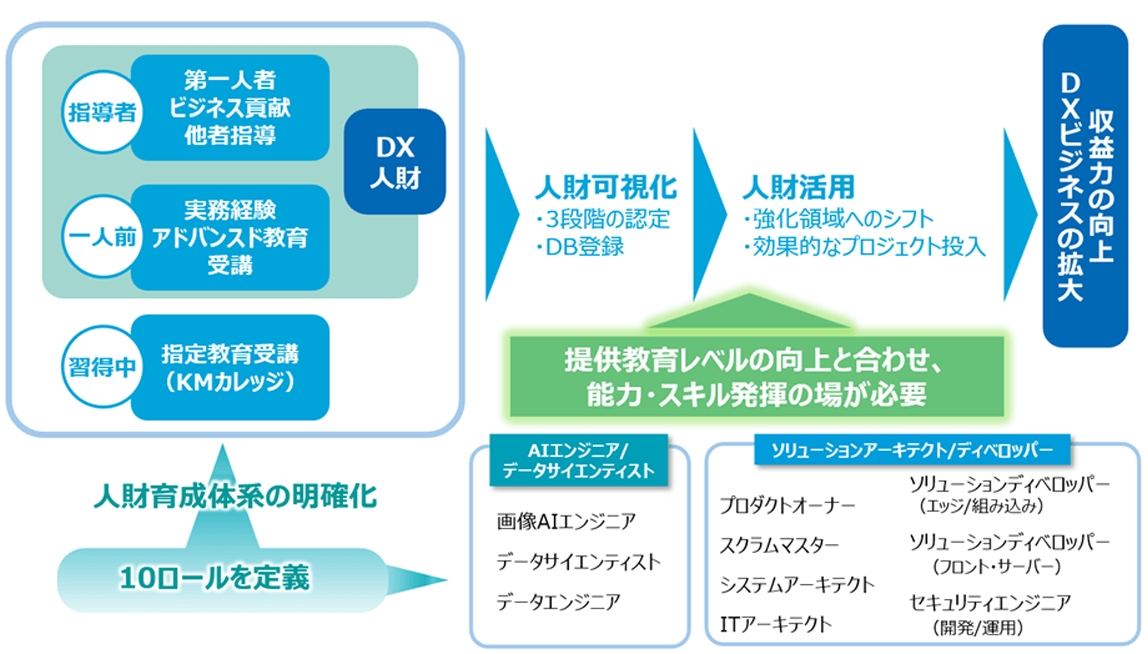 これを軸に発展させ、DX推進に必要なロールを定義し、そのロールに紐づけた育成体系の明確化を行っています。また、各ロールの人財数とレベルを可視化し、効果的な人財配置・育成を行う下地としています。