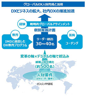 コニカミノルタグループ約4万人のうち4分の3を占める海外人財の全社での活用も優先順位の高い課題です。それを加速するためにDX関連で実績のあるスイスのビジネススクールIMDと協業し、グローバルビジネスリーダー育成を進めています。全グループの優秀人財を可視化し、選抜された人財に対し、育成プログラムや経営トップによるコーチングの提供、個別育成計画の策定を経て、実際の国境を越えたアサインメントを進めています。