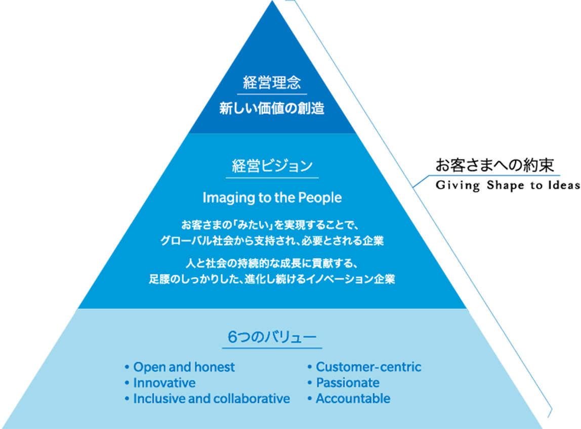 コニカミノルタは、人々の「みたい」に応え、新たな価値を創造してきました。2030年を見据えて、コニカミノルタのあるべき姿と社会的存在意義を、その原点かつ強みであるイメージング技術を通じて成し遂げていくことを表した長期での経営ビジョンステートメント「Imaging to the People」を掲げています。そして、これとともに2003年のコニカミノルタ発足以来不変の「経営理念」、価値創造の源泉としての企業文化・風土である「6つのバリュー」、そして「お客様への約束」を、コニカミノルタフィロソフィーとして体系化しています。