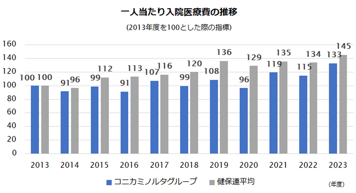 フィジカル面では、国内グループ会社全体で重症化予防に注力しています。特に、最も健康リスクの高い層の従業員は産業保健スタッフによる対応(保健指導や受診勧奨)を強化した結果、2024年度では、前回健康中計スタート時の2020年度比で約70%に減少しています。2023年度の従業員一人当たりの入院費は、2013年度と比較した場合、世間一般(健保連平均)が45%増加するなかで、当社は33%増に抑えられており、重症化予防策の効果が出ているものと推察しています。