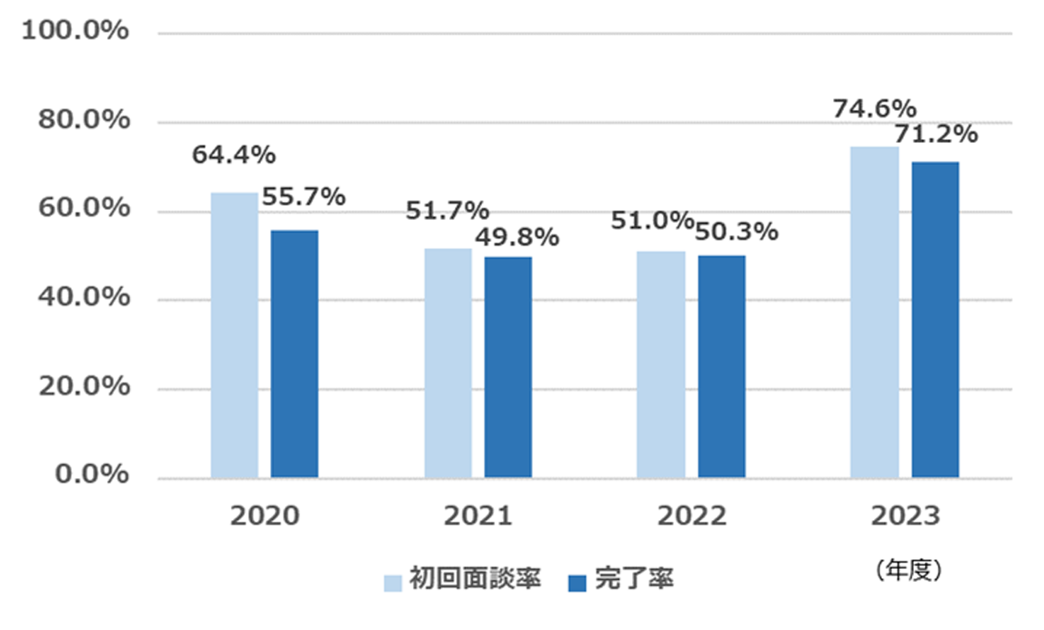 また、健康保険組合と連携して特定健診を実施し、その結果に基づいて、生活習慣病予防のための特定保健指導に取り組んでいます。2023年度からは、グループ面談を導入することにより、初回面談率、面談完了率とも、大幅に改善しました。