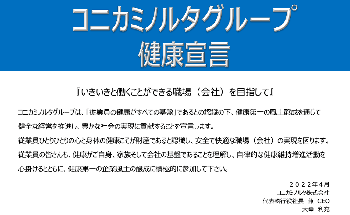 コニカミノルタは、「従業員の健康がすべての基盤」との認識のもと、「健康第一」の風土を醸成し、健康経営を推進しています。