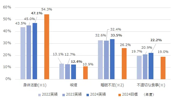 従業員の生活習慣については、コロナ禍以降、働き方が元に戻ってきたことで、運動と喫煙の項目は改善が見られましたが、睡眠と食事については課題が残りました。2025年度は引き続き食事習慣改善のための食育イベントや睡眠改善に向けたセミナーなどの施策を実施し、改善を進めていきます。