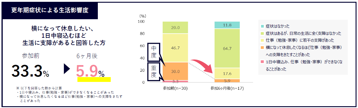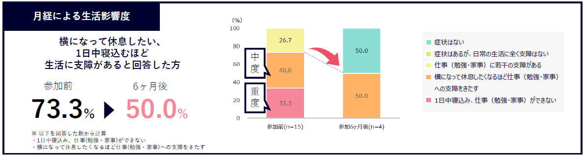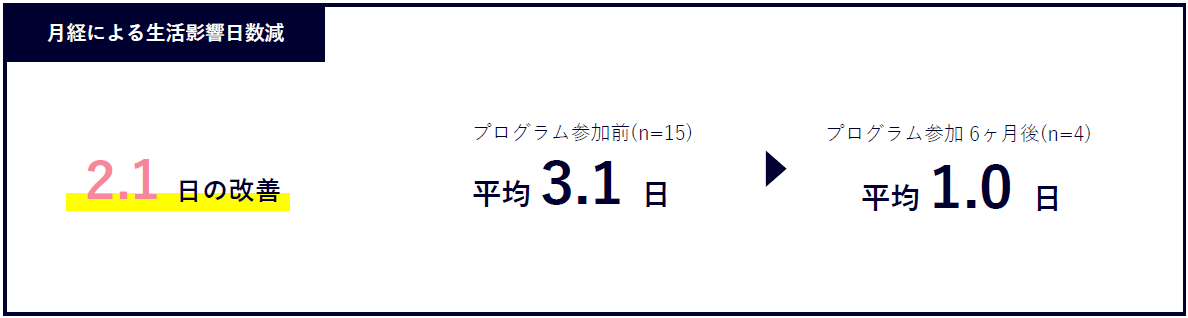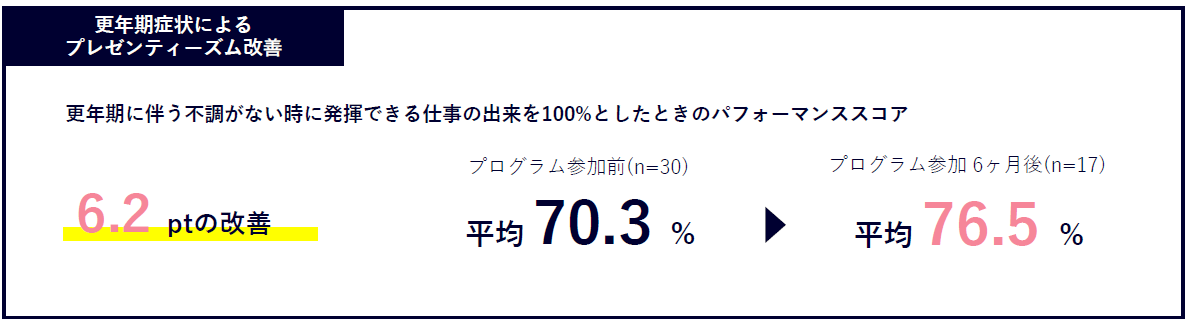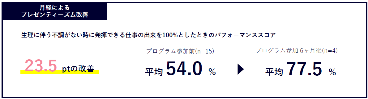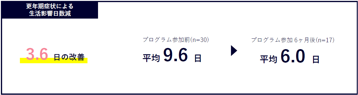 6カ月経過時に施策導入前後での女性従業員の「業務パフォーマンスの変化」を検証したところ、月経プログラムで23.5pt、更年期プログラムで6.2ptの改善が見られました。また、月経・更年期による不調が「1カ月のうちに影響を与える日数の変化」では、月経プログラムで2.1日、更年期プログラムで3.6 日の改善が確認されたとともに、プログラム利用者における中・重度の有症状者比率の減少(月経73.3%→50.0%、更年期 33.3%→5.9%)につながっており、これら検証データから、仕事における生産性にも良い影響が出ていると推測されます。