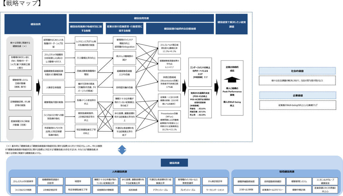 また、健康投資管理会計の考え方に基づいて、当社が実施している各種健康増進策(健康投資)が、従業員の健康度や生産性の向上にどのように影響し、経営課題の解決につながるかを体系的に整理した戦略マップを作成し、企業戦略との連携を図りながら、健康経営に取り組んでいます。