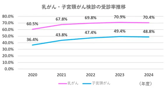 | 子宮頚 | 36.4% | 43.8% | 47.4% | 49.4% | 48.8% |