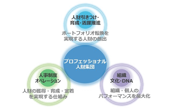 プロフェッショナル人財が集団として、最高のパフォーマンスを発揮するためには、それを可能とする組織風土や文化の醸成と、個々の力を引き出す制度・オペレーションの構築の両方が必要です。そしてこれらの取り組みをベースとした人財の引きつけ・育成・活躍推進を進めることで、組織のパフォーマンスが最大化されると考えています。