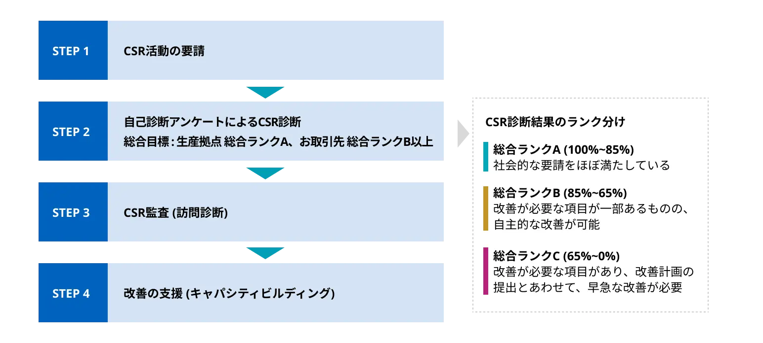 CSR活動の要請、CSR診断、CSR監査と改善支援によるCSR調達推進プログラムに取り組んでいます。