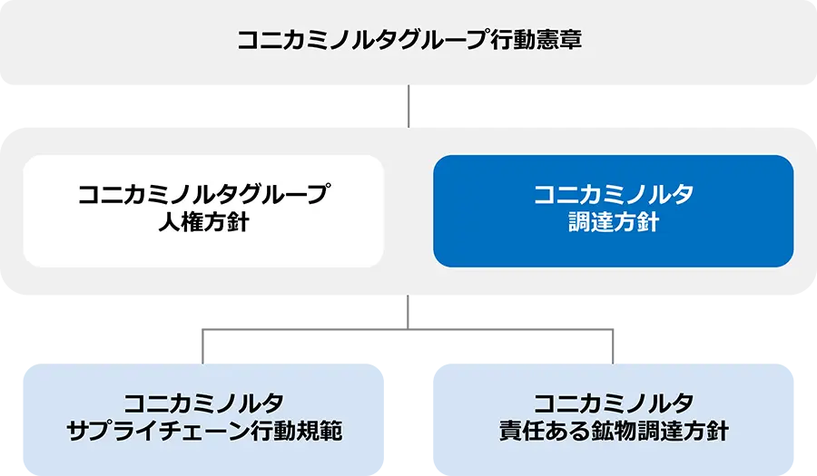 コニカミノルタでは事業活動を行う行動原則を「コニカミノルタグループ行動憲章」に定めており、人権の尊重や責任ある調達についてもその重要な要素としています。さらにその行動原則に基づき、「コニカミノルタグループ人権方針」や「コニカミノルタ調達方針」を策定しています。