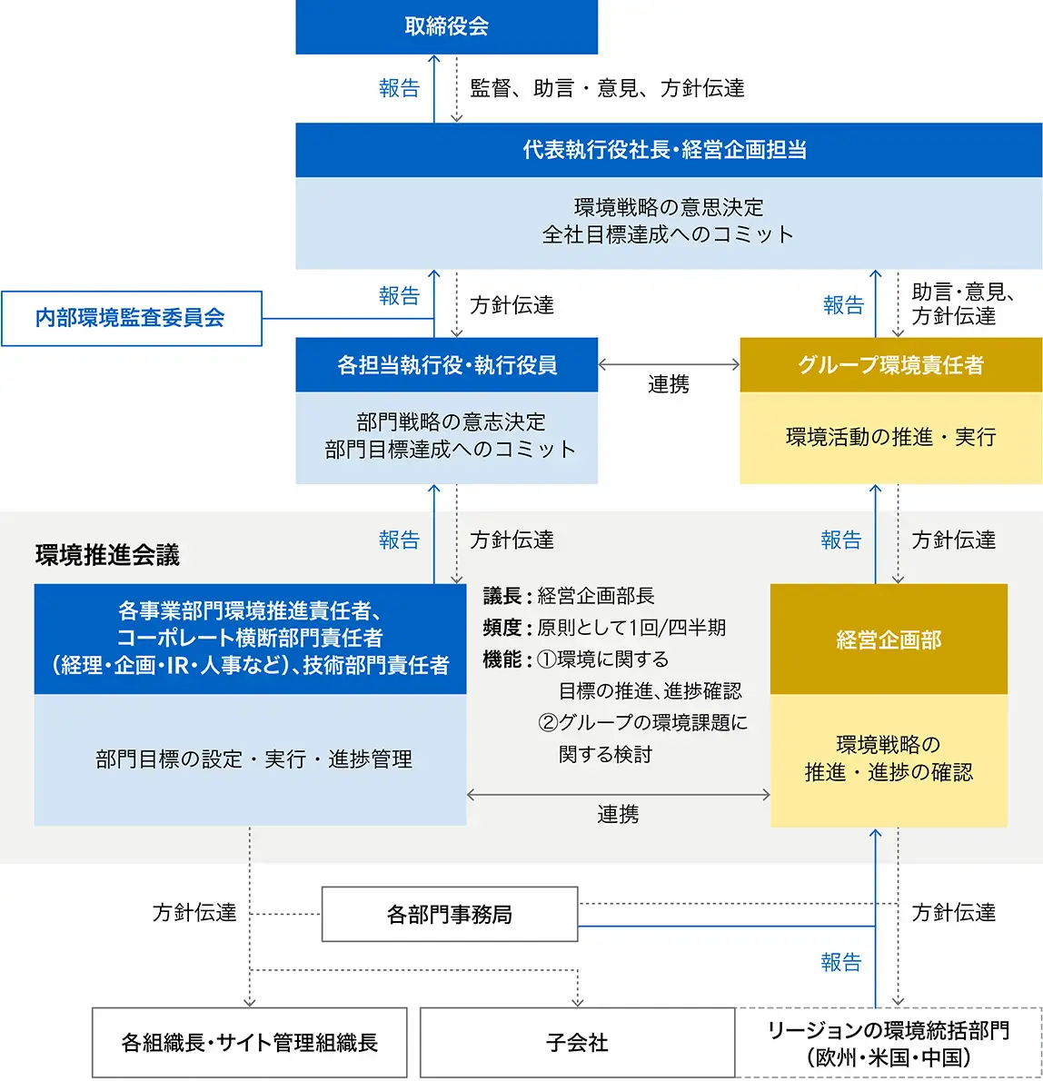コニカミノルタは、サプライチェーンにおける社会的責任を果たすため、リスクマネジメント担当役員が管轄するリスクマネジメント委員会のもと、全社体制を設置し、その中でCSR調達活動を推進しています。経営企画部門、法務部門、生産企画部門を中心に全社的な活動を進めるとともに、事業領域ごとにCSR調達推進責任者を選任し、それぞれのサプライチェーンリスクを適切に管理しています。