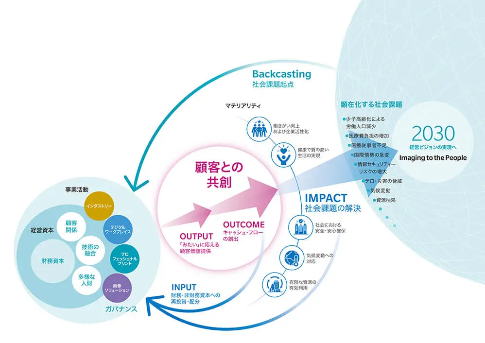 当社の各事業はマテリアリティを意識した価値創造に取り組んでいます。例えば、インダストリー事業では、製造現場で熟練工の経験値に基づくスキルに依存していた検査工程を自動化・省人化することで熟練工の技術継承問題を解決すると同時に、最終製品の高品質化に貢献することで「働きがい向上および企業活性化」に寄与しています。また、プロフェッショナルプリント事業では、適時・適量・適所での生産による輸送・保管・廃棄・中間材の低減といった顧客のサプライチェーンの変革を通じて「気候変動への対応」と「有限な資源の有効利用」に寄与しています。さらに、画像ソリューション事業では早期発見・早期診断による「健康で質の高い生活の実現」に寄与しています。