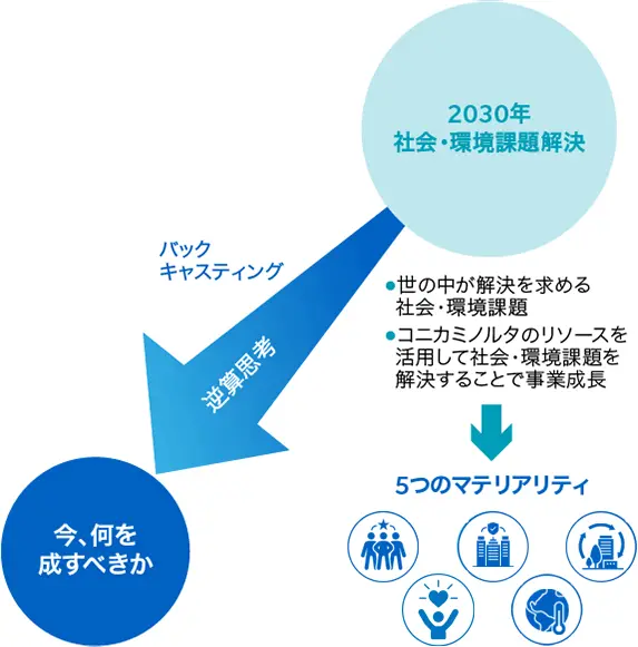 人口増加、少子高齢化、デジタル革命の進行、バイオテクノロジーの利用拡大、世界構造の多極化、気候変動の深刻化など、複雑化するマクロ環境のなか、将来の予測は難しくなっています。このような不透明で不確実な時代であるからこそ、コニカミノルタのDNAを再確認し2030年にコニカミノルタが取り組むべき社会・環境課題として5つのマテリアリティを2020年に特定し、そこから逆算して、「今、何を成すべきか」を設定しています。