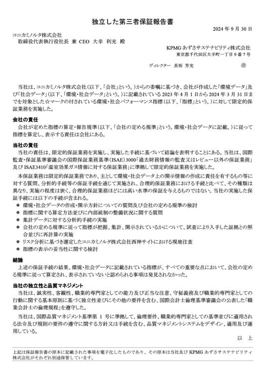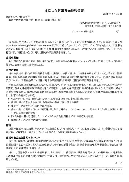調達、生産/研究開発、製品輸送、販売・サービス、製品使用、製品廃棄に起因するCO2排出量、スコープ1排出量、スコープ2排出量(会社基準およびマーケット基準)、エネルギー使用量、再生可能エネルギー由来電力使用量、非再生可能エネルギー消費量、VOC大気排出量、取水量(上水2排出量、スコープ1排出量、スコープ2排出量(会社基準、マーケット基準およびロケーション基準)、エネルギー使用量、再生可能エネルギー由来電力使用量、VOC大気排出量、取水量(上水/地下水/雨水)、正規従業員数(男女別)が、コニカミノルタが定める基準に従って把握、集計、開示されているかについて、KPMGあずさサステナビリティ(株)による保証を受けています。保証対象指標には☆マークを付しています。