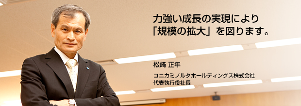 当社グループは、2011年4月、将来にわたって持続した成長の実現に力点を置き、「Growth(成長)」をキーワードとして中期経営計画『Gプラン2013』をスタートさせました。2011年度から2013年度の3カ年の取り組みの基本方針は、1)成長の実現による規模の拡大、2)「真のグローバル企業」への進化、3)「コニカミノルタ」ブランドの認知度向上、の3点です。さらに、この『Gプラン2013』に連動させて、コミュニケーションメッセージ“Giving Shape to Ideas: 革新はあなたのために”を新たに策定しました。ここには、お客様が考え、求めているものをお客様の視点で見つめ、そしてそれをかたちにする実行力・実現力のある企業としての強い意志を表しています。この旗印の下、わたしを含めて社員ひとり一人の責任ある行動を『Gプラン2013』で描く成長の実現につなげることで、当社グループが“力強く成長を続け、社会から必要とされる企業”となることを目指していきます。