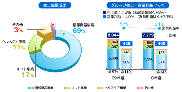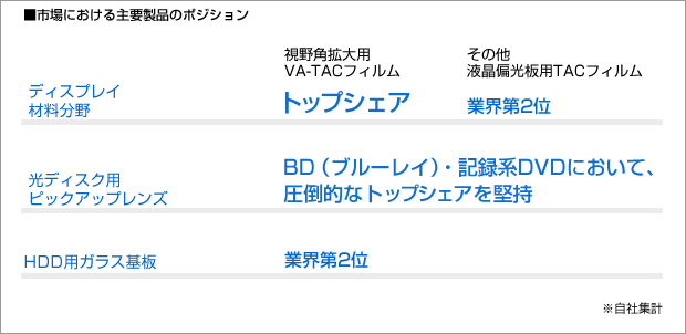 メモリー分野: AV機器やPCに使用されるDVDやブルーレイディスク用の対物レンズを中心とした光ピックアップレンズ事業、ノートPCに主に使用される2.5インチのHDD用ガラス基板を展開しています。