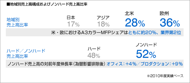主力のオフィス分野と成長領域となるプロダクションプリント分野で構成されています。