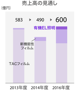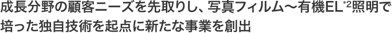 成長分野の顧客ニーズを先取りし、写真用フィルムや液晶偏光板用TACフィルム、有機EL*2照明等で培った当社の独自技術を起点に新たな事業を創出することで、成長基盤の確立を目指します。