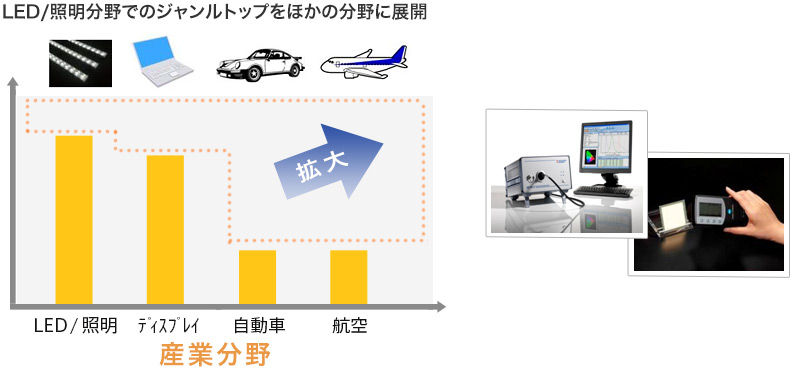 当社はディスプレイ光源色測定分野のトップメーカーとして、業界のスタンダードモデルとなっている高品質な測定機器を提供してきました。近年急激に普及しているLED照明の計測ニーズに応えるため、LEDを含む照明業界において、その技術力、営業力に強みを持つ同分野のトップ企業インスツルメントシステムズ社をグループに加え、光測定器のラインアップを強化しました。それにより、総合的な光源色測定分野でグローバルトップの地位を確保しましたが、今後は自動車や航空機などの物体色の分野でもジャンルトップを狙っていきます。
