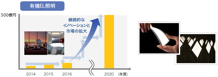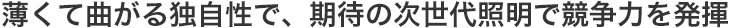 機能材料事業分野では、次世代照明として期待される『有機EL照明』において、独自開発した「青色リン光材料」により世界最高レベルの発光効率を達成しました。2014年度からの本格的な事業展開に向け、樹脂基板フレキシブル有機EL照明パネルの量産工場を建設し、2014年秋より量産を開始します。当工場では、生産性に優れるロール・ツー・ロール方式*1を導入し、白色および調色機能付の樹脂基板フレキシブル有機EL照明パネルを世界で初めて量産します。当社は次世代照明事業においても新しい価値を生かした市場開拓を進め、将来のジャンルトップ事業の確立を目指します。