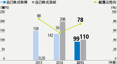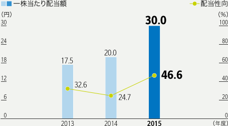 その一方で、事業活動から創出された利益・キャッシュは、戦略投資にあてるとともに、できる限り株主・投資家の皆様に還元していきたいと考えています。2015年度は、年間株主配当を昨年から10円増配の一株当たり30円とさせていただきました。また株主の皆様への利益配分を鑑み、2015年5月から7月にかけて総額99億円に上る自己株式取得(取得株式総数657万株)を実施したほか、2016年6月には前回取得済の900万株を消却しました。なお、2016年度の年間配当については、厳しい事業環境もあり当期と同じ一株当たり30円を予定しています。
