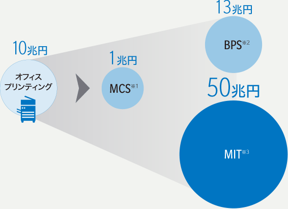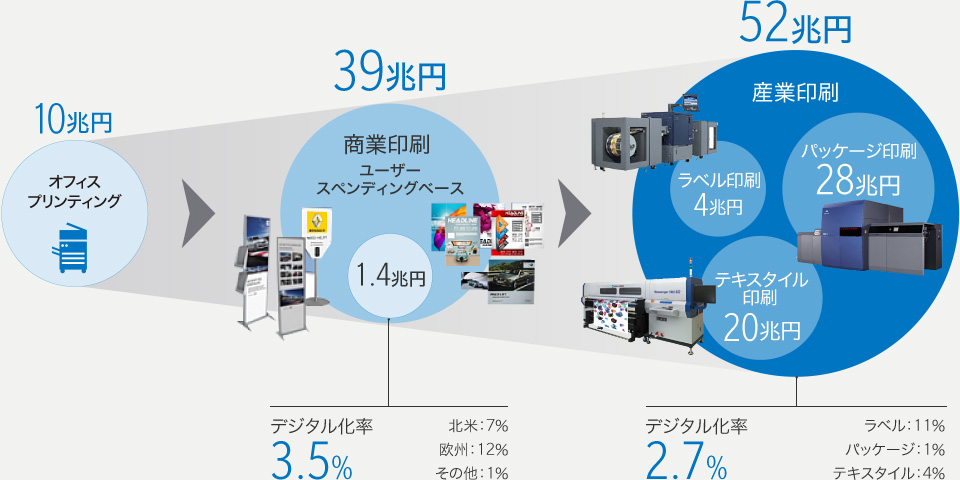 商業・産業印刷分野では、紙媒体を中心とした商業印刷や、パッケージ・ラベル・テキスタイルなどの産業用印刷を対象に、「オンデマンド・デジタル型」への変革提案に最注力していきます。世界で39兆円の市場規模を持つ商業印刷市場において、デジタル化率はわずか3.5%に過ぎず、世界52兆円規模の産業印刷市場でも2.7%にとどまっています。しかしながら、印刷するための「版」を必要としないデジタル印刷には、小ロットや短納期での印刷には優位性があり、現在でも商業印刷企業の主たる生産設備であるオフセット印刷機と併用するためにデジタル印刷機を導入する印刷企業が増えています。さらに、「必要な時に、必要なところで、必要なだけ」印刷することに適したデジタル印刷は、バリューチェーン全体の環境負荷低減にもつながります。こうした観点から「デジタル化」への潜在ニーズは非常に高く、今後、世界規模で確実に「プリンティングのデジタル化」が進むだろうというのが私の予測です。2016年4月にラベル・パッケージ分野のデジタル化に強みを持つ仏MGI社へ追加出資を行ったのも、同市場での競争力を高めることが狙いでした。
